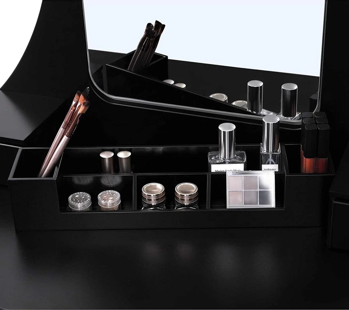 - CREËER UW PERSOONLIJKE SCHOONHEIDSHOEK: De aanblik van deze zwarte kaptafel met frameloze spiegel en kruk garandeert een begin van de dag met stijl, formaat en glamour chic